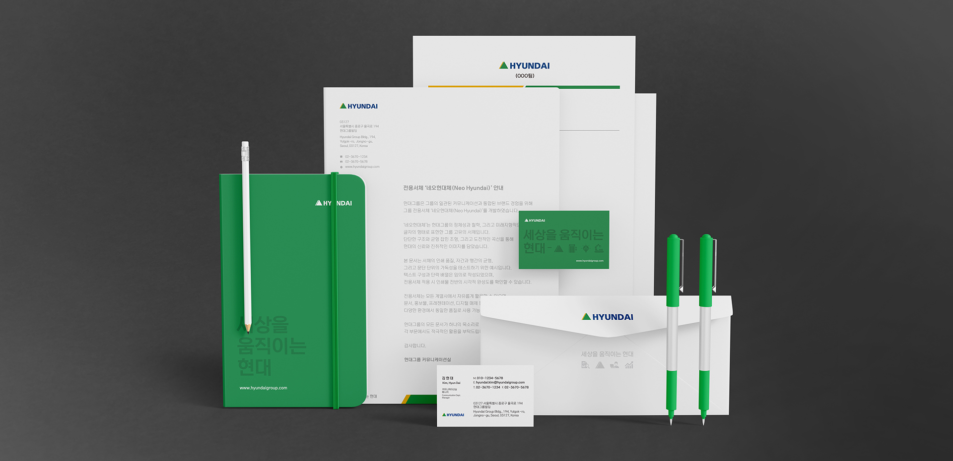 '네오현대’는 네모틀에 꽉 찬 골격으로 안정적이고 믿음직한 인상을 주는 현대그룹 전용서체입니다.