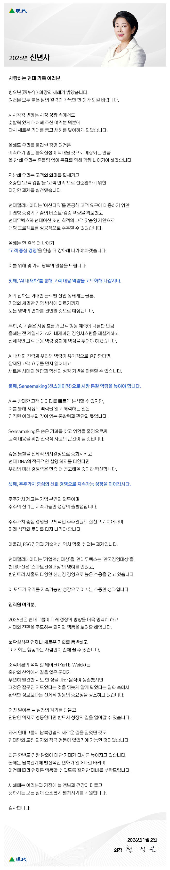 현정은 회장, “불확실성 속 선제적 행동과 실천이 중요”… 2026년 신년사